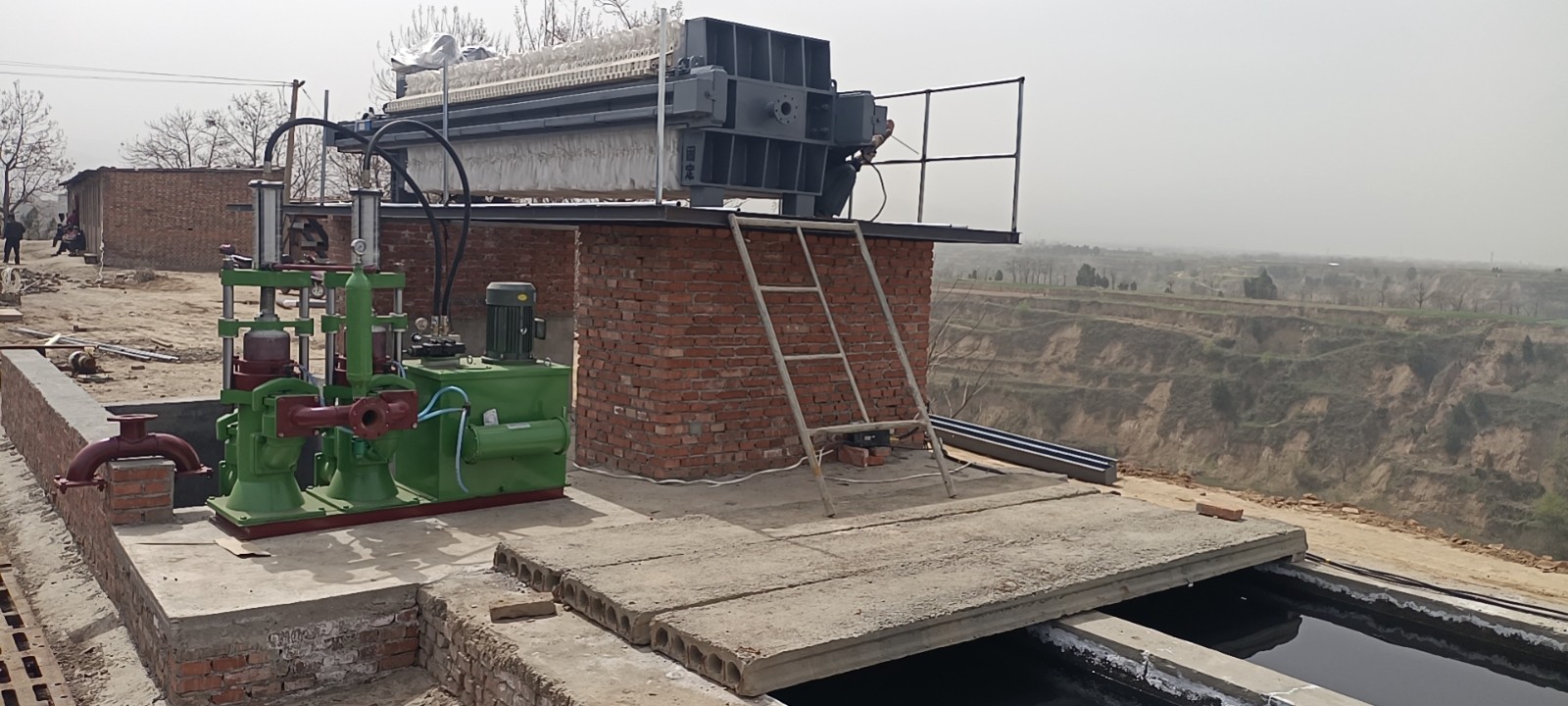 通過注塞泵將中和后的污水打入壓濾機,壓濾機進行固液分離,污泥被壓濾機濾布攔截在力室,過濾后的清水通過濾板下水好的流出,較終流到脫硫塔上水池水循環利用,實現零排放。